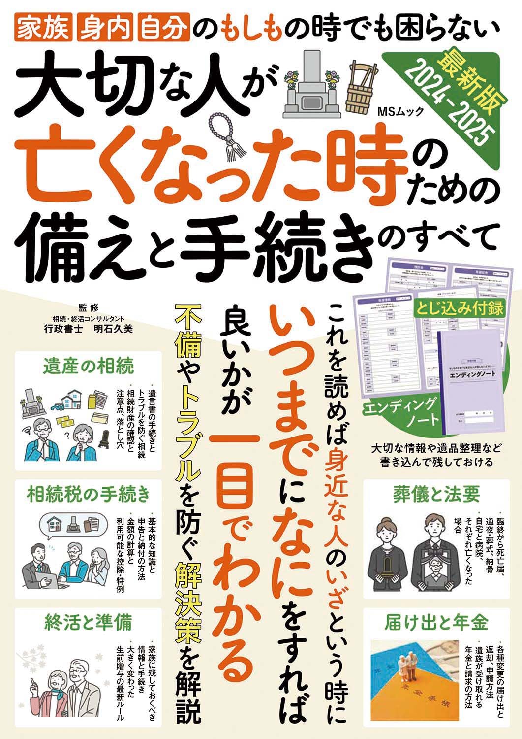 自分の家族や身の回りの人など、大切な人が亡くなった時に何をすればよいのかをわかりやすく解説。亡くなった直後、またいつまでに何をするかといった必要な手続きや、相続についてなどの死後の対応はもちろん、将来トラブルにつながらないために生前にやっておくべき事などが、ひと目でわかります。大切な人、そして自分の「もしも」の時でも、この一冊を読めば安心です。必要な事項をまとめておけるエンディングノート付き。